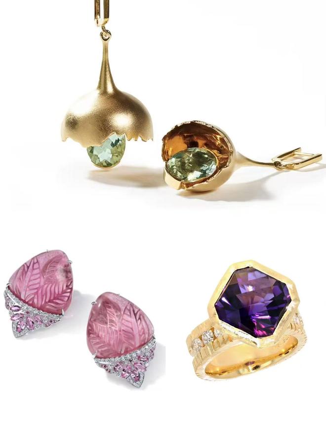 粉碧玺雕刻的叶片浪漫至极、绿色紫水晶与黄金打造的蛋壳妙趣横生、花式切割的紫水晶戒指更是令人耳目一新......每一件作品都凝聚了设计师和工匠们的心血与智慧,让人眼前一亮。