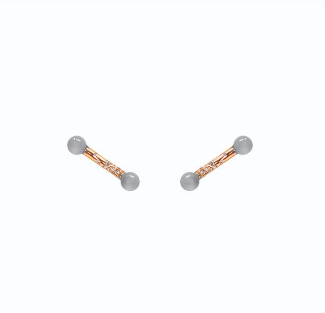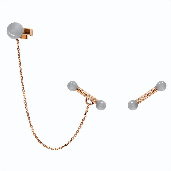 而Benedicte de Boysson却大胆地跳出了这个框架,一侧的耳环用一根链条将上下两部分连起,两头点缀的灰色月光石圆珠,颜色淡雅、低调,零星点缀的小克拉钻石,则为整体造型增添一丝时尚感。