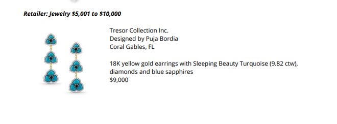 这件荣获【Retailer, Jeweler up to $5,000】的耳环,乌黑的煤精镶嵌出耳环的主体轮廓,营造出深邃而神秘的氛围感。