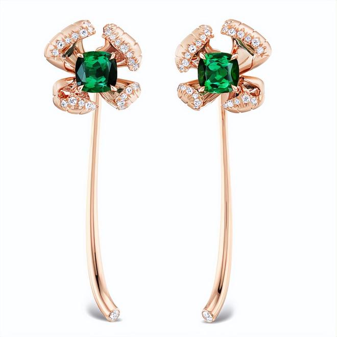 每只耳环上各点缀一朵精致的小花,绿色托帕石点缀的花蕊,颜色浓郁、明亮,充满生机,玫瑰金材质的花瓣,纹理刻画细腻入微,边缘点缀的钻石,增添精致感,造型栩栩如生。